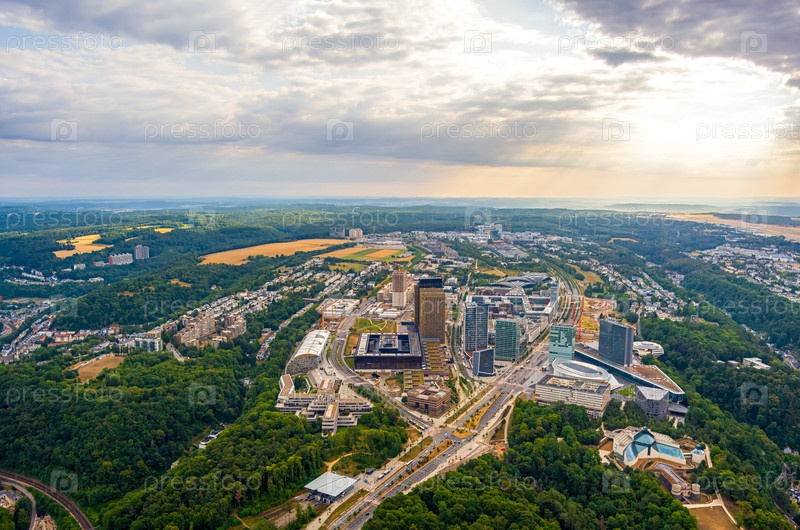 Люксембургский город, Люксембург. Район Кирхберга. Панорама города. Летний день, облачная погода. Вид с воздуха