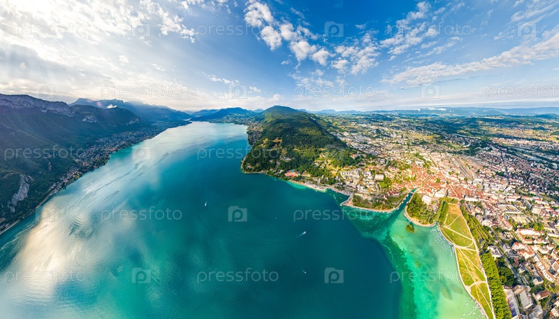 Озеро Аннеси с окружающими горами и деревнями Панорама летом Французские Альпы Вид с воздуха