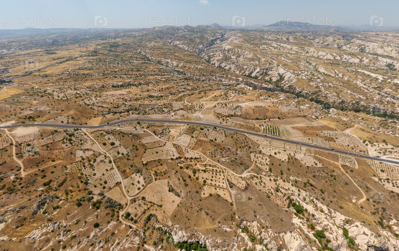 Широкий взгляд с воздуха на летнюю идиллию Каппадокии, с золотыми плато, изумрудной лентой долины и далекими голубыми горами под безоблачным небом