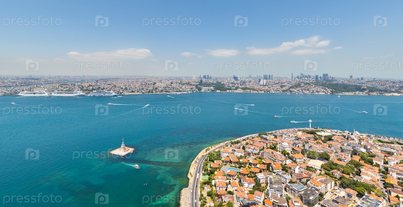 Босфор с сухим грузоносцем в заливе Золотого Рога, вид на Девичью башню, районы Фатих, Бейоглу и Ускудар