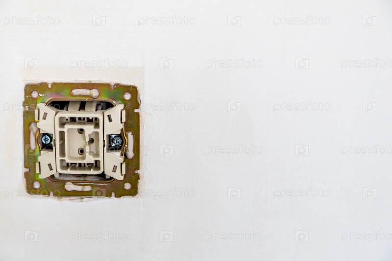 Демонтированный электрический выключатель на штукатурной стене