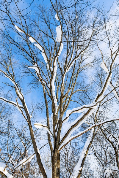 Заснеженный ствол дерева и голубое небо на заднем плане