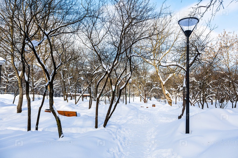 Пешеходная тропинка, пройденная сквозь снежные заносы в городском парке