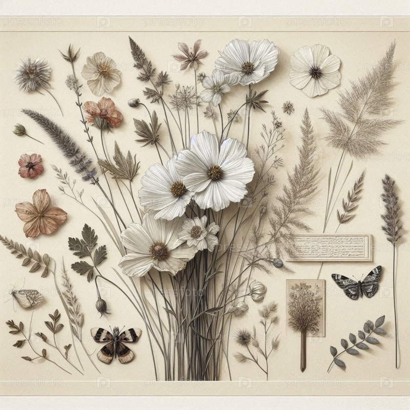A dried flowers herbarium art print, Ai generated image А сушеные цветы гербария художественная печать, Ай создал изображение