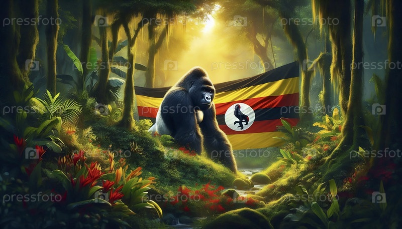 Угандийский флаг в пышном тропическом лесу и горных гориллах, Ai generated image