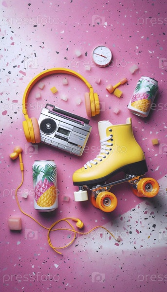 Игровой плоский слой роликовых коньков и тропическая фруктовая банка соды на розовом полу из терраццо, Ai generated image