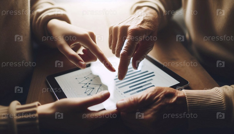 Ментор направляет младшего коллегу, их руки вместе указывают на сложную диаграмму данных на планшете, Ai generated image