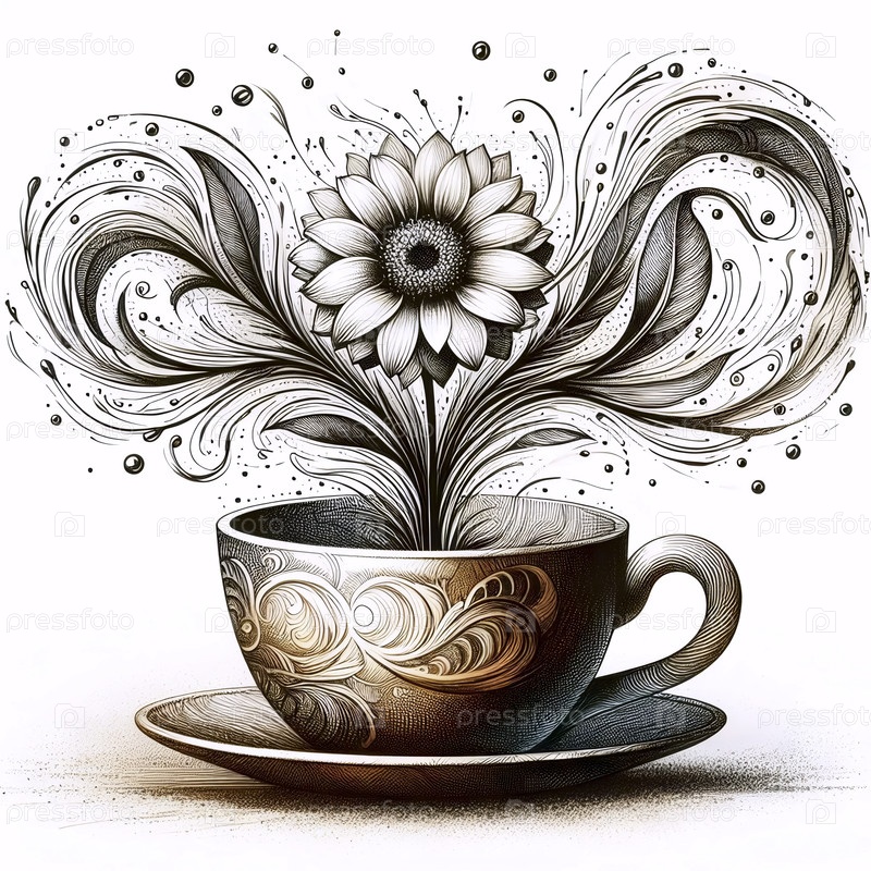 Растение в кофейной чашке чернила А рисунок художественная печать, Ai generated image