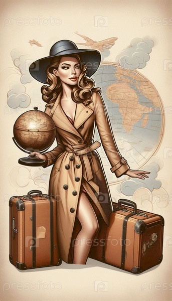 Пин-ап девушка с чемоданом и земным шаром, готовая к приключениям, Ai generated image