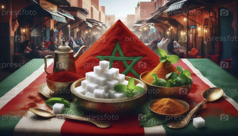 Марокканский флаг на рынке пряностей и культуре мятного чая, Ai generated image