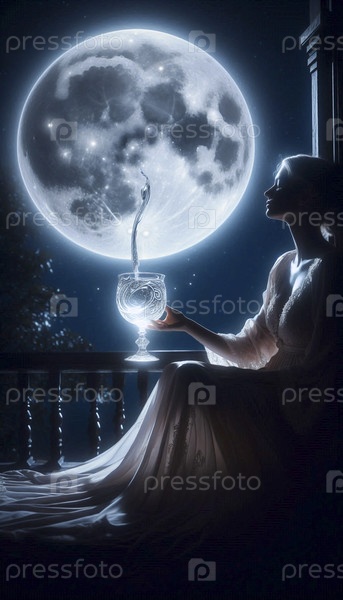 Женщина пьет лунный свет из кристаллической чаши, Ai generated image