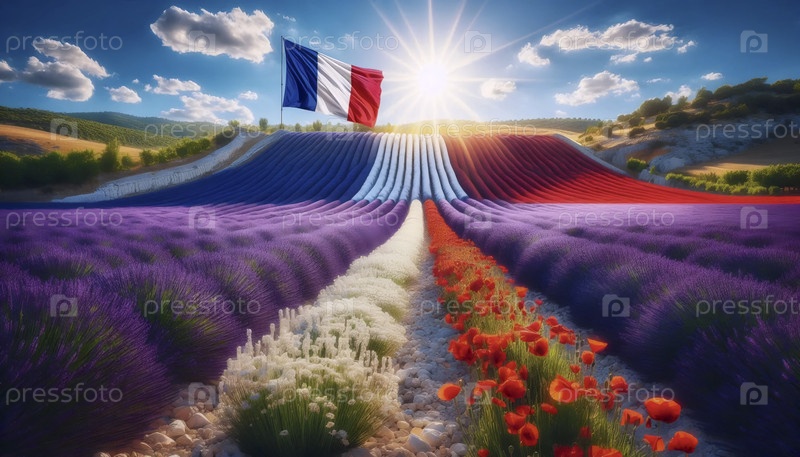 Французский флаг на полях лаванды в Провансе, Ai generated image