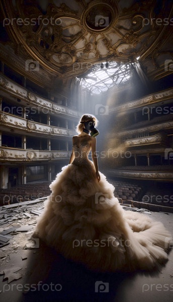 Женщина в газовой маске и вечернем платье в заброшенной опере, Ai generated image