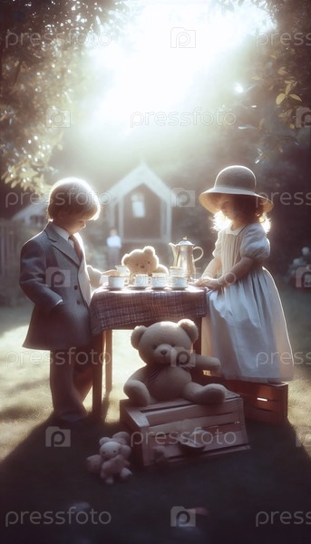 Очаровательный плакат чайной вечеринки с плюшевым медведем на заднем дворе, Ai generated image