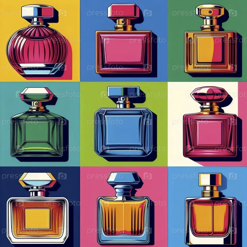 Поп-арт цветовое исследование винтажных бутылок парфюмерии, Ai generated image
