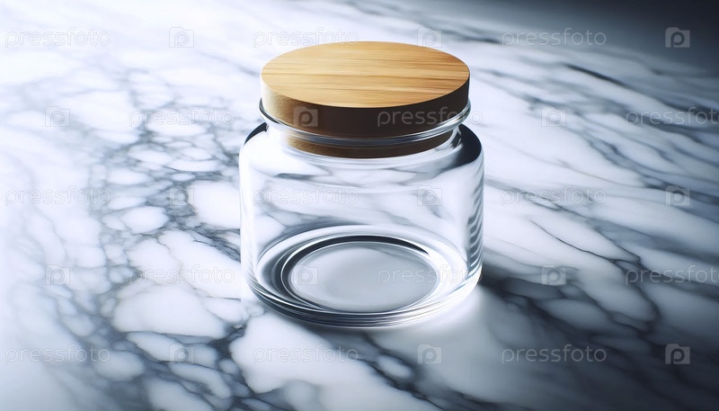 Макет пустой стеклянной банки с бамбуковым крышкой, на мраморной поверхности, Ai generated image