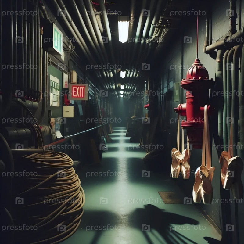 Широкий, атмосферный снимок слабо освещенного коридора за кулисами с гидрантом в качестве фокусной точки