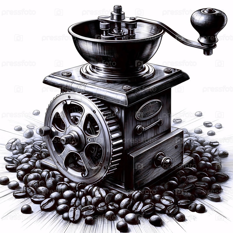 Кофейная мельница и бобы чернила для рисования художественный печат, Ai generated image