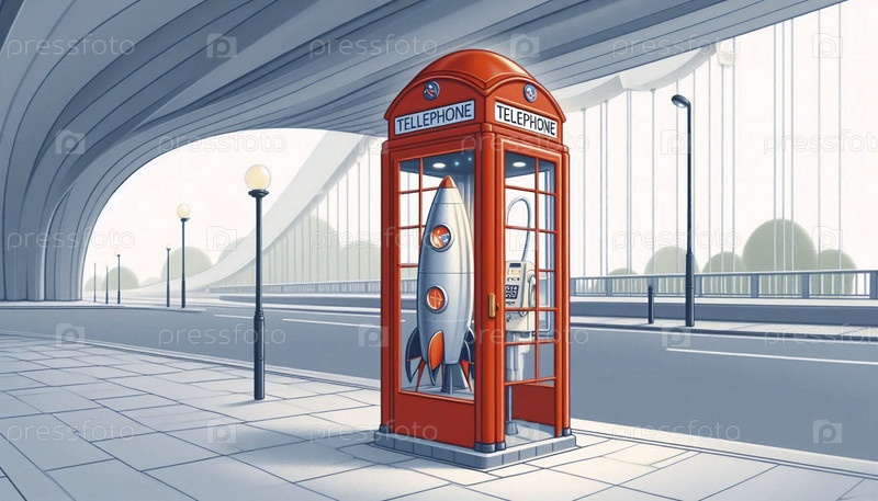 Ретро-футуристическая общественная телефонная будка в форме личного ракетного корабля, Ai generated image