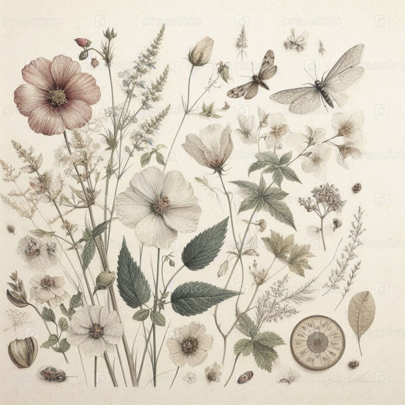 A dried flowers herbarium art print, Ai generated image А сушеные цветы гербария художественная печать, Ай создал изображение