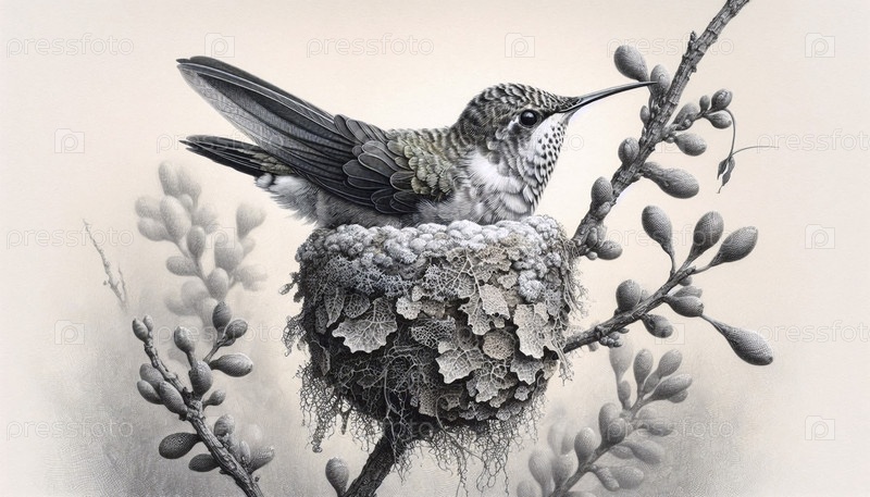 Колибри, размножающийся в крошечном гнезде чернила рисует художественную печать, Ai generated image
