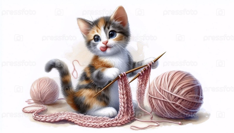 Кошка вяжет шарф акварельный арт-принт, Ai generated image