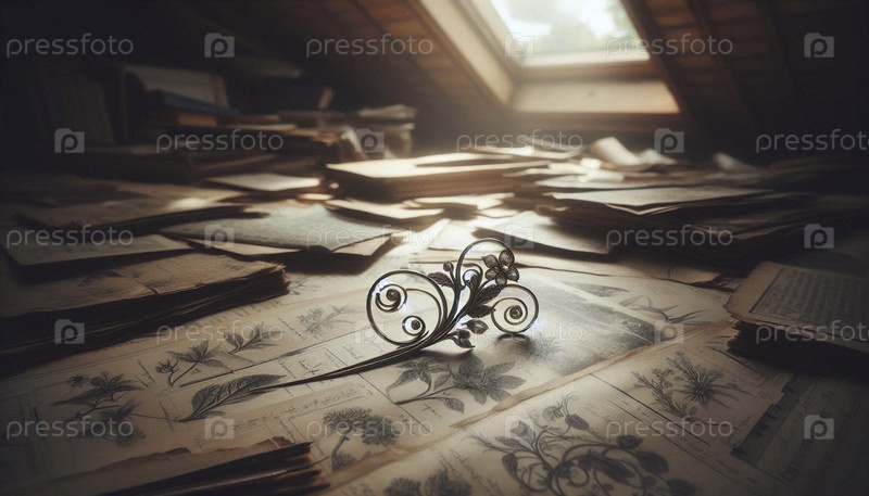Пустой, модернистский макет настройки шприца для волос, размещенный над распространением выцветших ботанических иллюстраций, Ai generated image