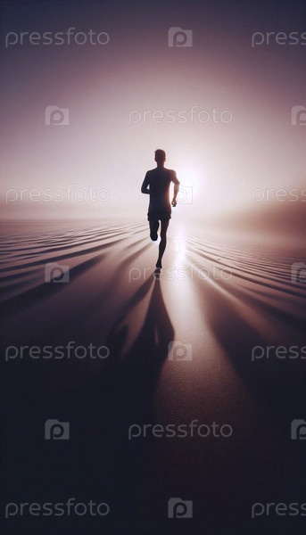 Силуэт одинокого бегуна на туманном пляже при восходе солнца, олицетворяющий свободу и энергию, Ай создал изображение