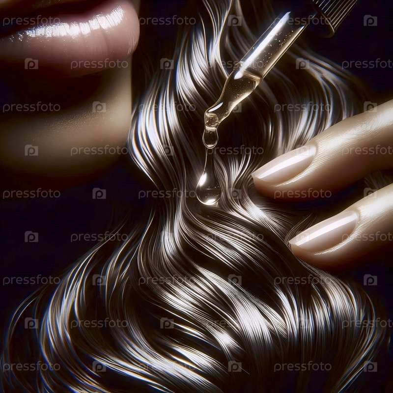 Детальный снимок роскошной рутины ухода за волосами: сыворотка, наносимая на влажные, текстурированные волосы