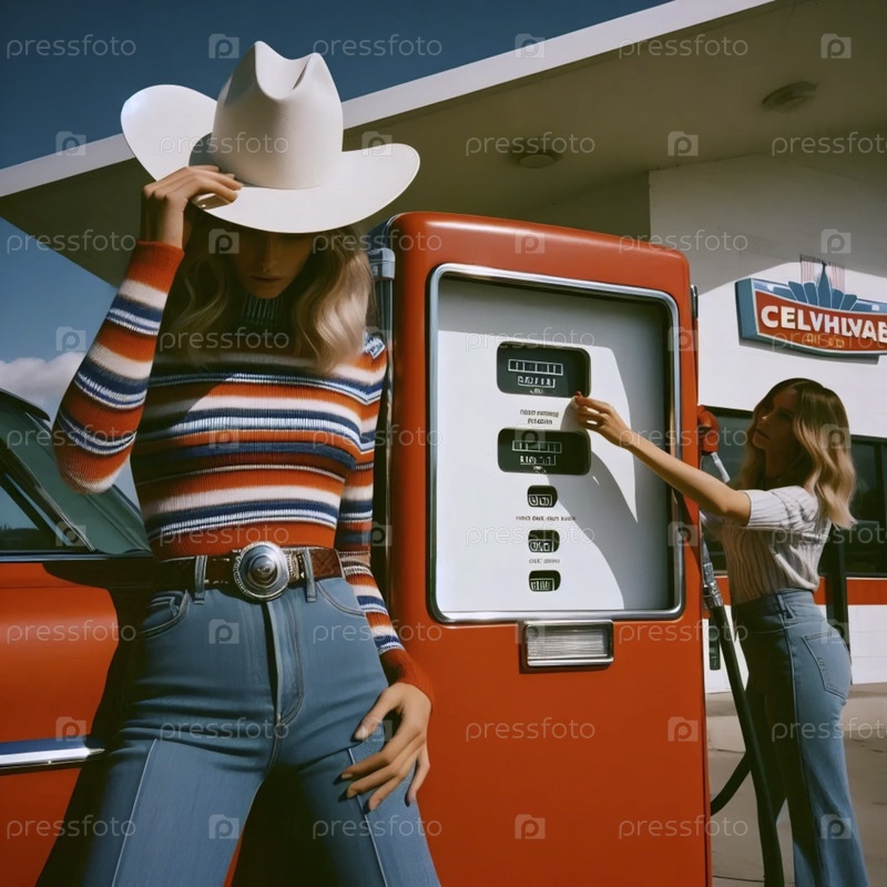 Модные съемки на старинной заправочной станции, Ai generated image