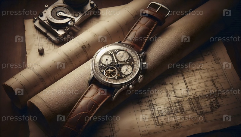 Удаленные наручные часы, лежащие на чертежах, Ai generated image