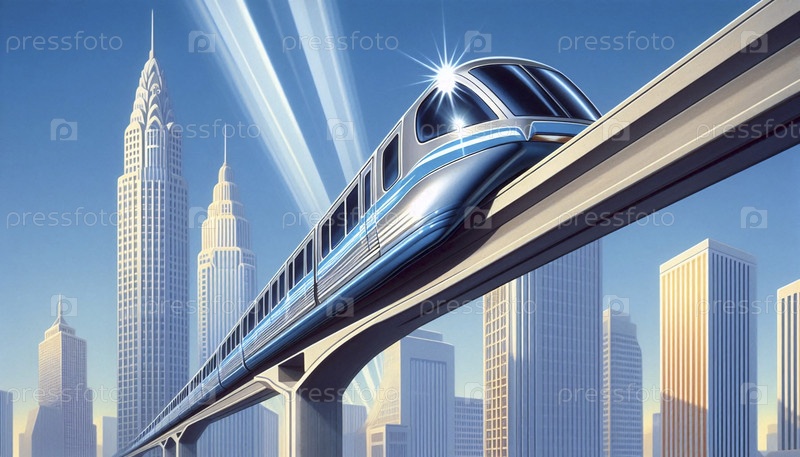 Оптимизированный монорельсовый поезд, плавающий тихо по одной поднятой дорожке через футуристический центр города, Ai generated image