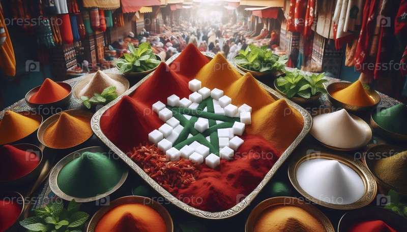 Марокканский флаг на рынке пряностей и культуре мятного чая, Ai generated image