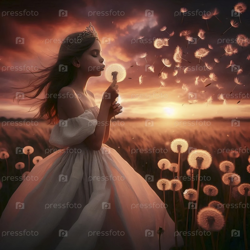 Принцесса, делающая желание на одуванчике акварельный арт-принт, Ai generated image