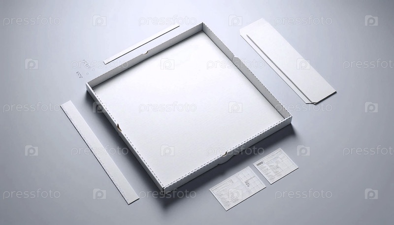 Плоский, не смонтированный макет коробки пиццы, показывающий внутреннюю печатную зону на сером фоне