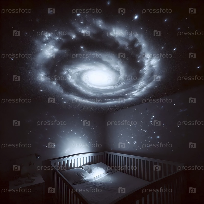Звездная ночная проекция создает волшебный потолок в темной, спокойной детской комнате, Ai generated image