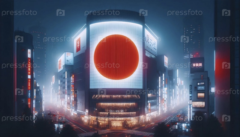 Японский флаг в современных технологиях и неоновом городском ландшафте, Ai generated image
