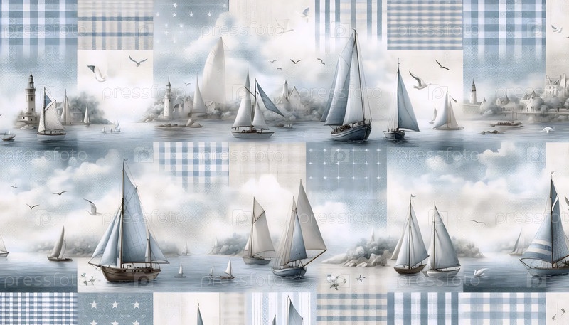 Нежная акварель парусники мягкие гингемские ландшафтные полосы звездный шаблон, Ai generated image