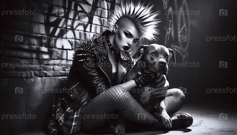 Панк-девушка со своей собакой в переулке, Ai generated image