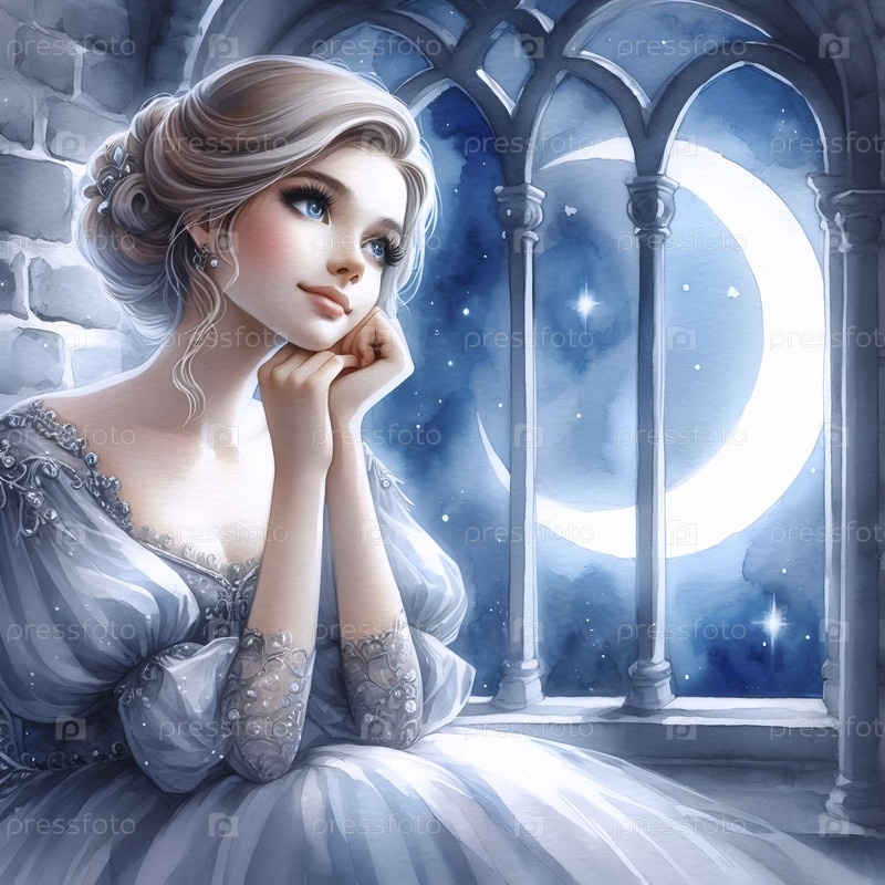 Принцесса, смотрящая на звезды в башне акварельный художественный печат, Ai generated image