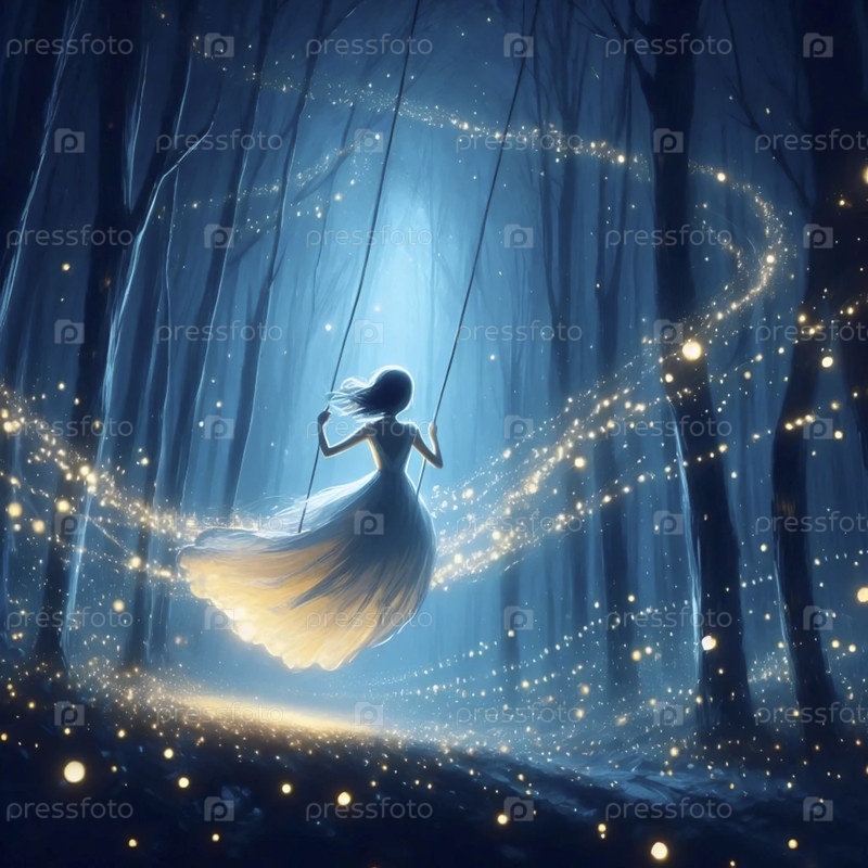 Светящийся качели, установленный в темном лесу с факелами, Ai generated image
