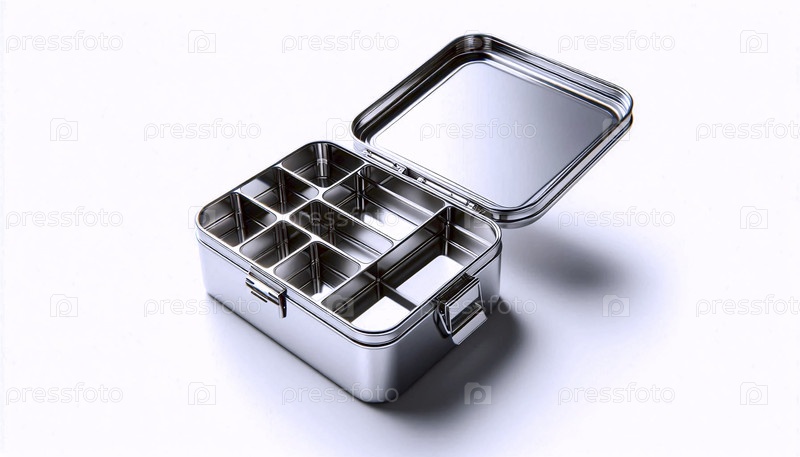 Утонченный, разделенный на отсеки макет обеденной коробки из нержавеющей стали, открытый и пустой, на белой поверхности Ai generated image