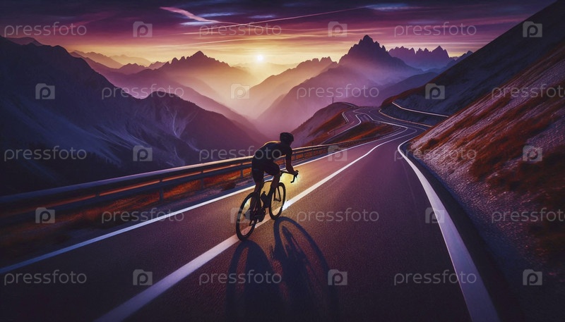 Приключенческий велосипедист покоряет извилистую горную дорогу на закате, оглядываясь назад, Ai generated image