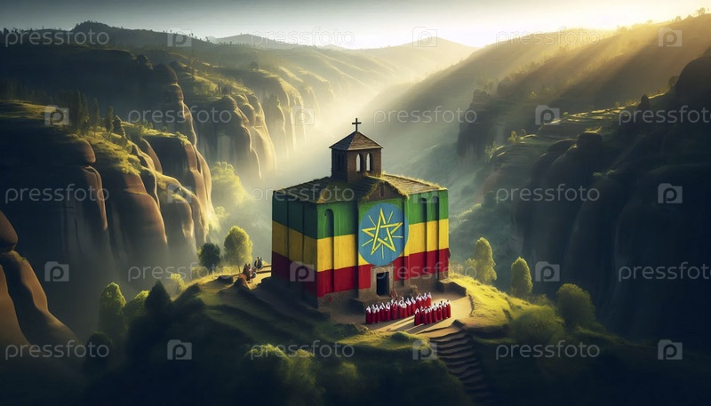 Эфиопский флаг в древних церквях, высеченных в скале Лалибелы, Ai generated image