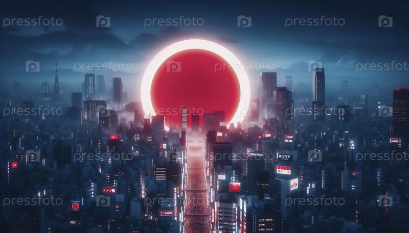 Японский флаг в современных технологиях и неоновом городском ландшафте, Ai generated image
