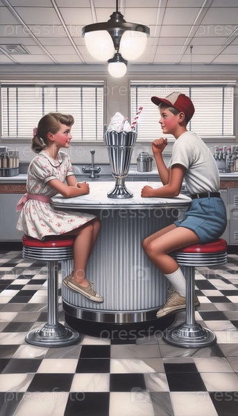 Ретро-постер двух детей, делящихся молочным коктейлем, Ai generated image