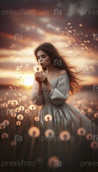 Принцесса, делающая желание на одуванчике акварельный арт-принт, Ai generated image
