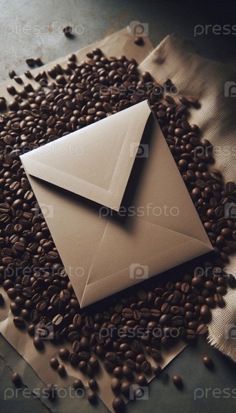 Мокет конверта из крафт-бумажной бумаги с пустым квадратом для адреса, лежащего на кровати свободных кофейных зерен, Ай создал изображение