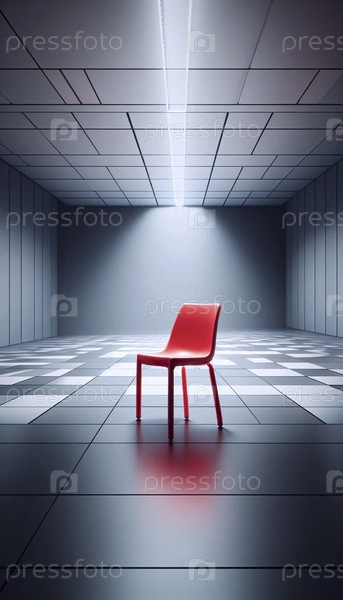 Мокет одного ярко-красного формованного пластикового стула в пустом виртуальном выставочном зале, Ai generated image