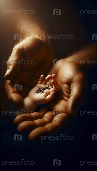 Более широкий, мягко освещенный портрет рук отца в колыбели руки ребенка, Ай создал изображение